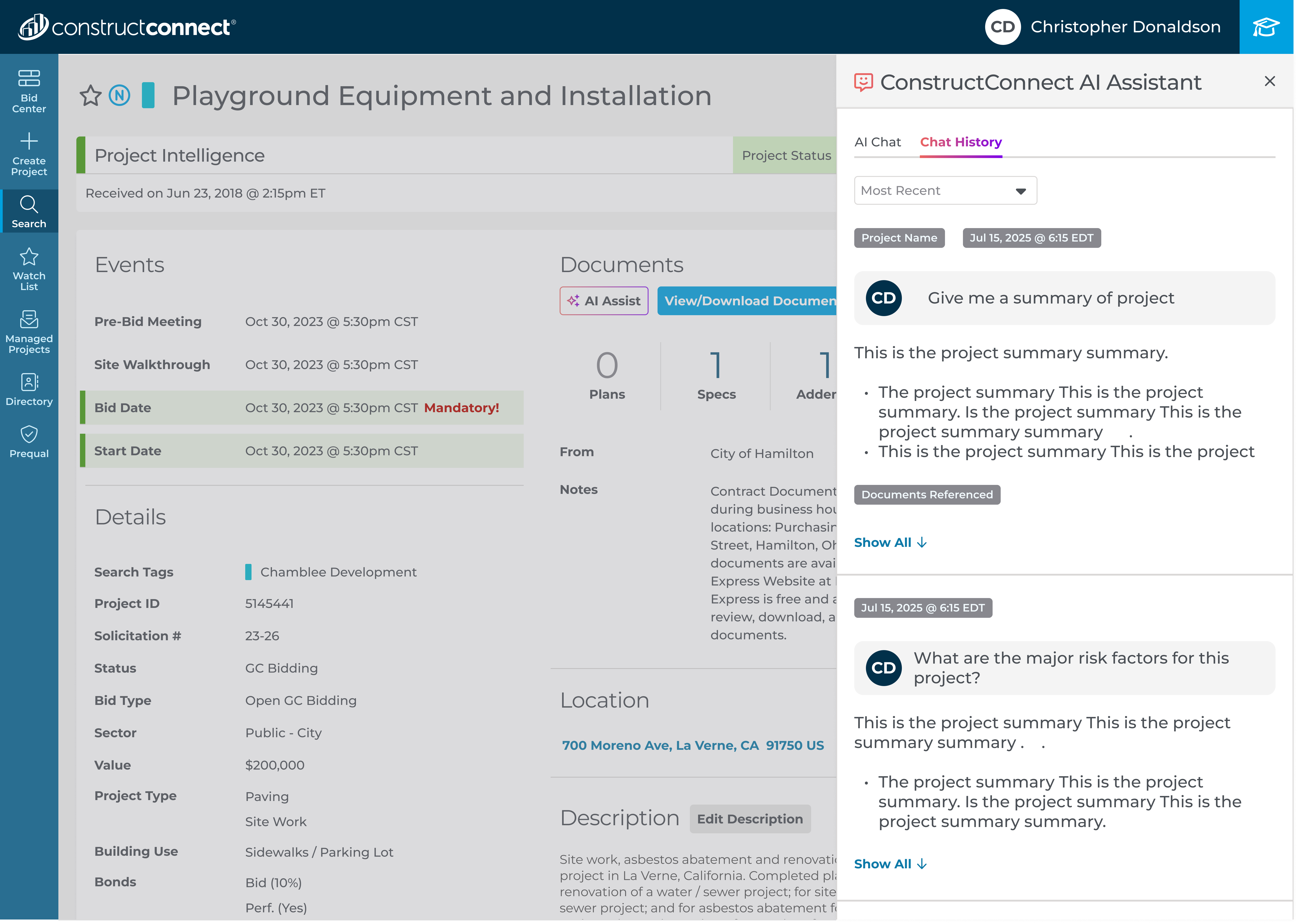 Our AI-powered solution is integrated into the Project Detail Pages for workflow integration. By allowing users to ask questions in natural language, the chatbot provides fast, accurate responses that are directly sourced from the projects documents. This not only saves time but also enhances decision-making by ensuring that contractors have access to the most relevant information without the need for manual document review.