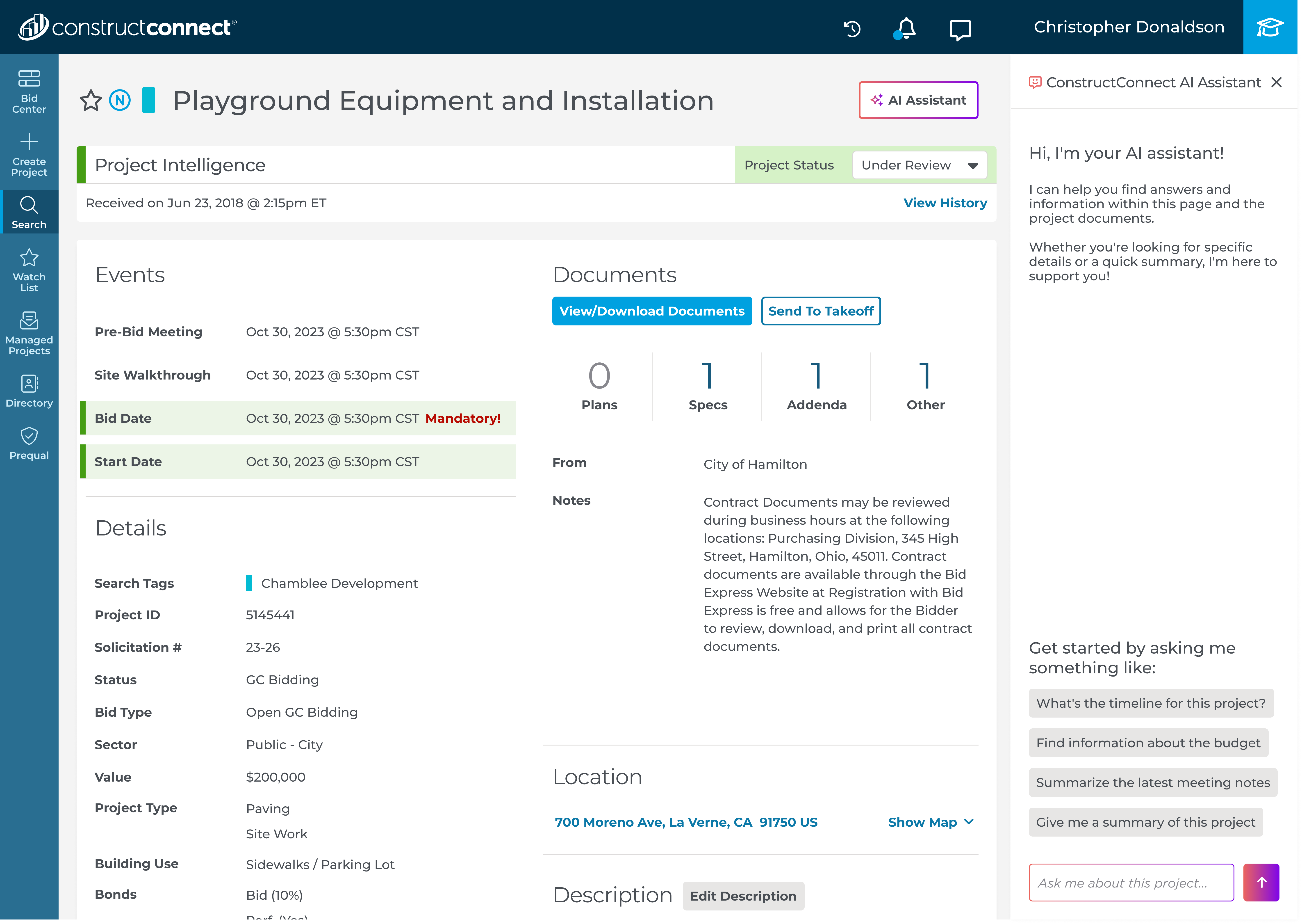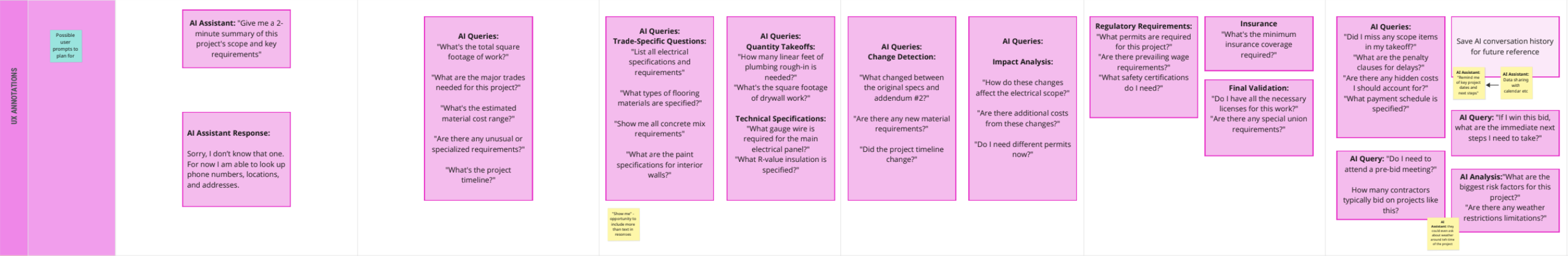 Construction contractors spend hours manually reviewing 200+ page document sets to extract key project information for bidding decisions. This time-intensive process creates bottlenecks and often leads to missed opportunities or costly oversights. The UX Callouts below illustrate potential questions our users might ask.