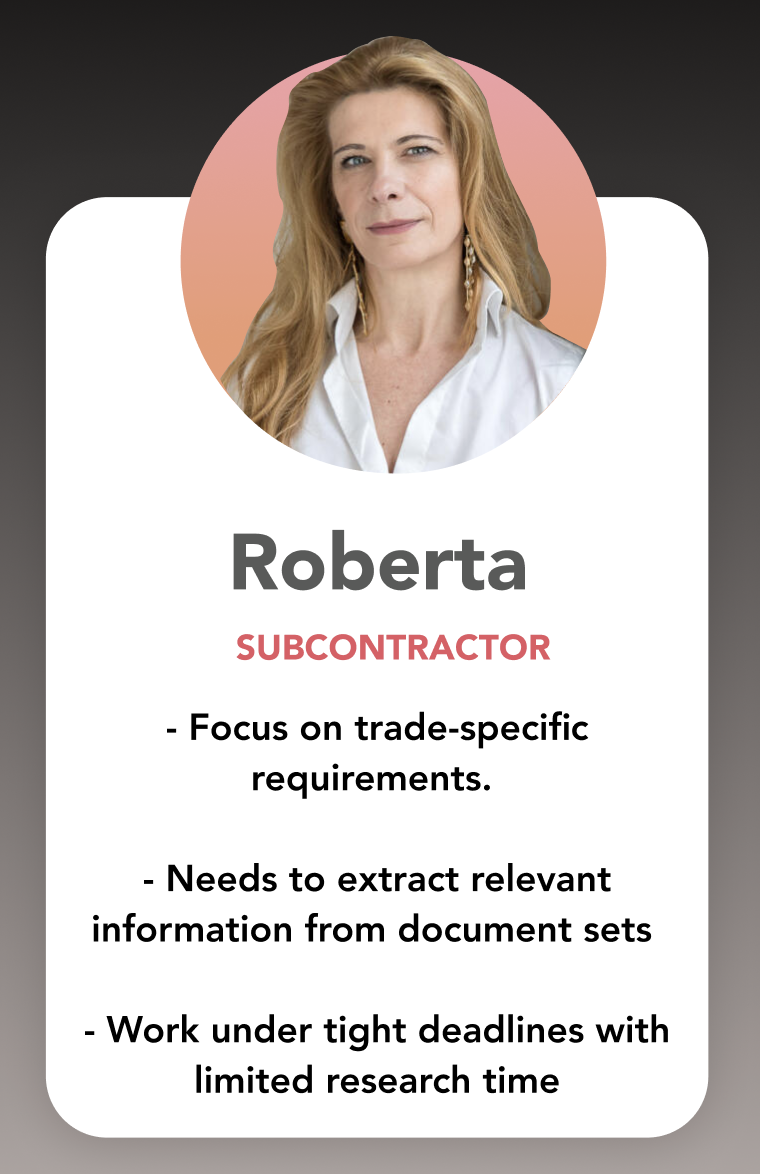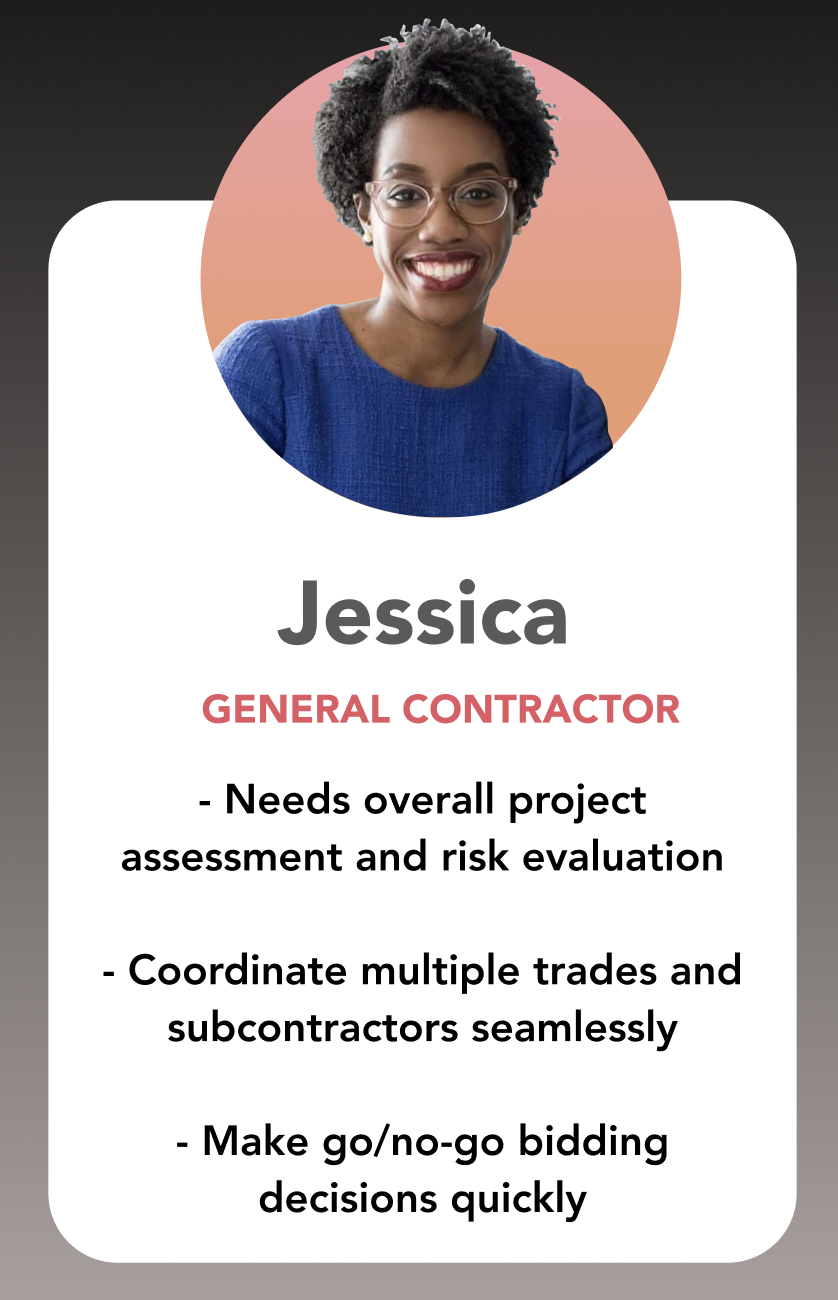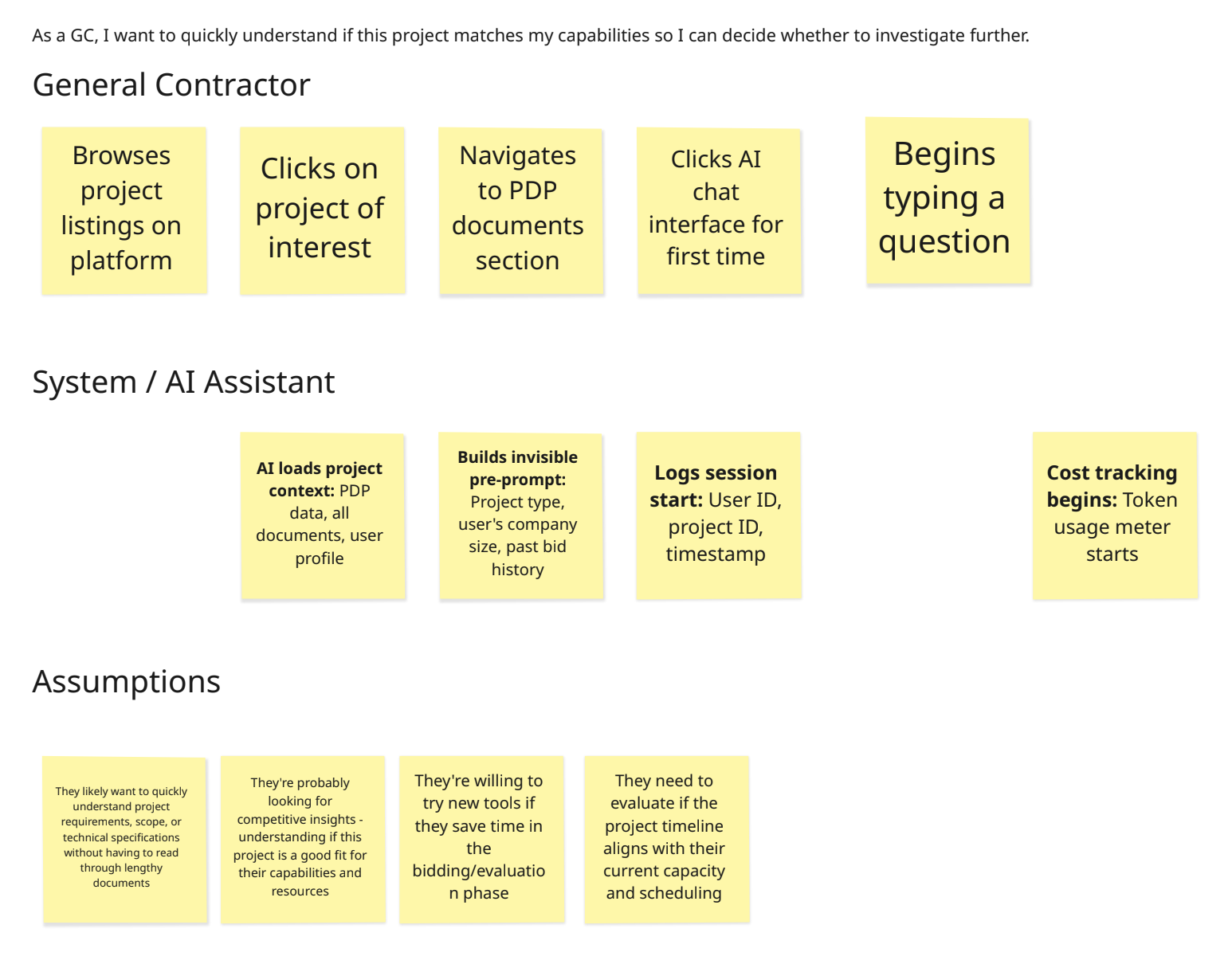 Through research, I identified three user personas: primary users are general contractors, secondary are subcontractors, and tertiary are estimators. I mapped the contractor bidding journey, pinpointing pain points where an AI assistant could add value, revealing contractors' need for varied information at different stages.