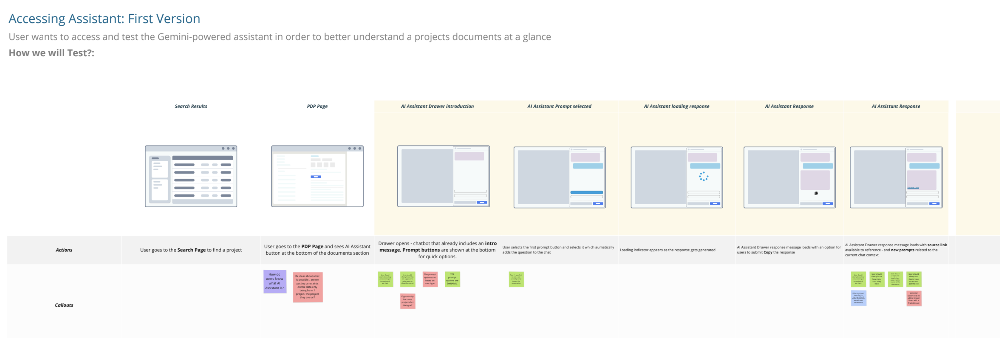 The user journey map was instrumental in shaping both the interface design and the AI training requirements. It also helped validate task flows with stakeholders before committing to high-fidelity designs. This map outlines the journey of our primary personas, General Contractors, as they search for new projects to bid on and review necessary documents before submitting their bids.